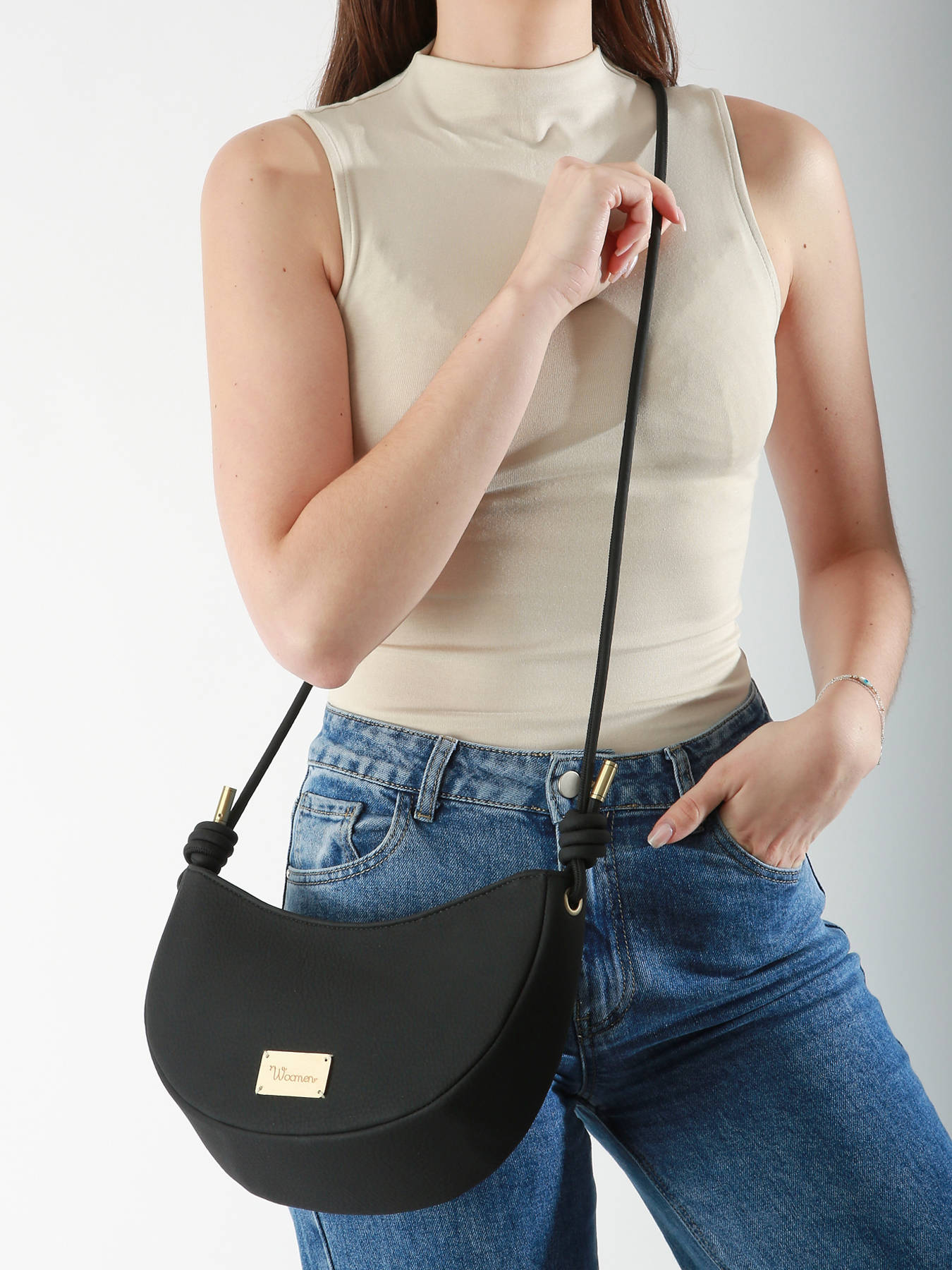 De WOOMEN cross body tas uit de MUSCARI-lijn, gemaakt van gerecycled polyurethaan met een voering van katoen en linnen, heeft een nieuwe vorm en wordt crossbody gedragen met schuifknopen. Hij wordt gesloten met een rits, heeft een verstelbare schouderriem en een enkel compartiment met een ritsvak voor praktische organisatie.