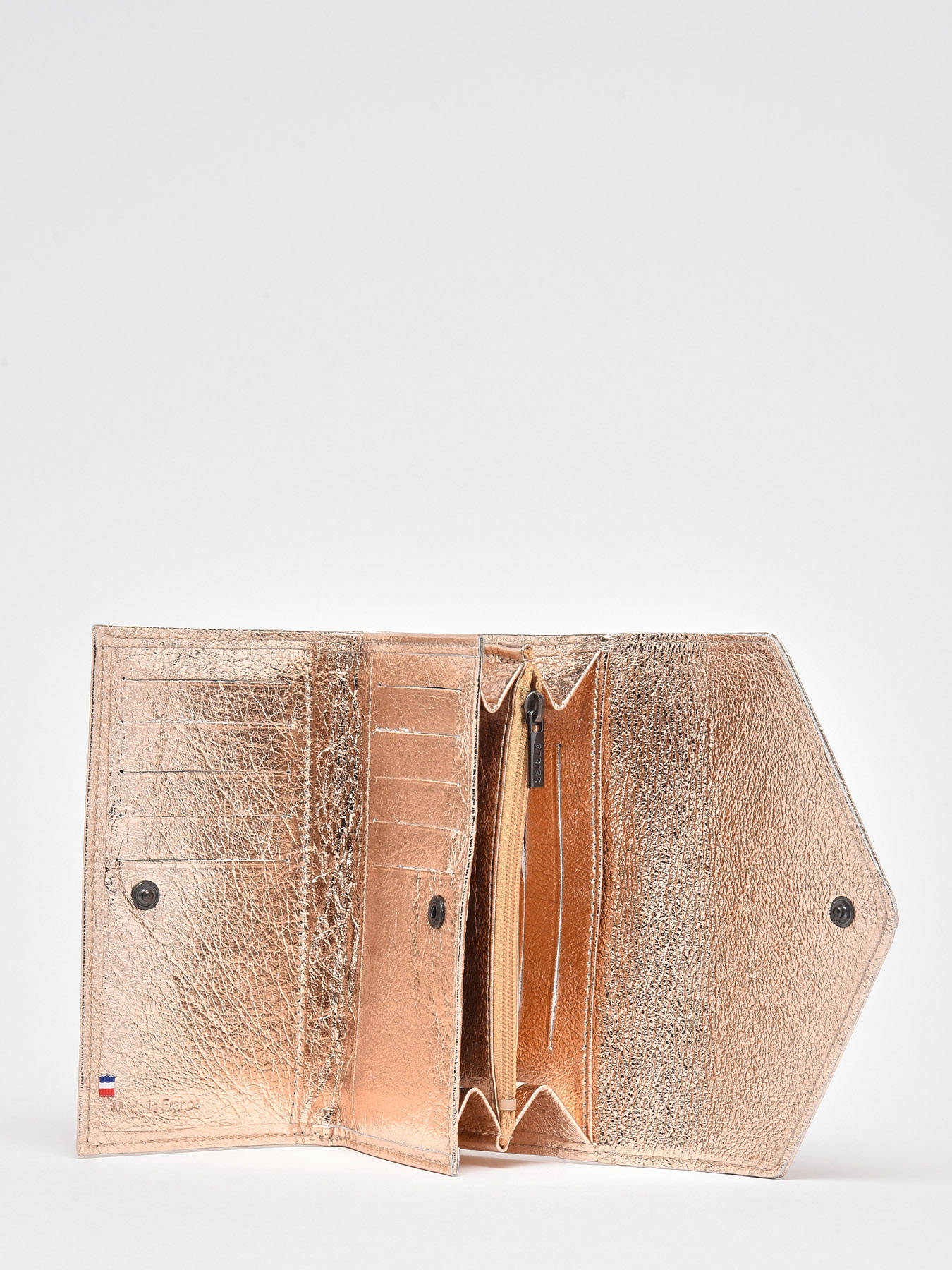 Deze portefeuille van rundsleer komt uit de Etincelle irisee lijn. Het sluit met behulp van een drukknopje en beschikt over 3 open steekvakjes, 10 gleuven voor bank- en klantenkaarten, een vakje voor biljetten, een ritszakje en een zakje met drukknop.