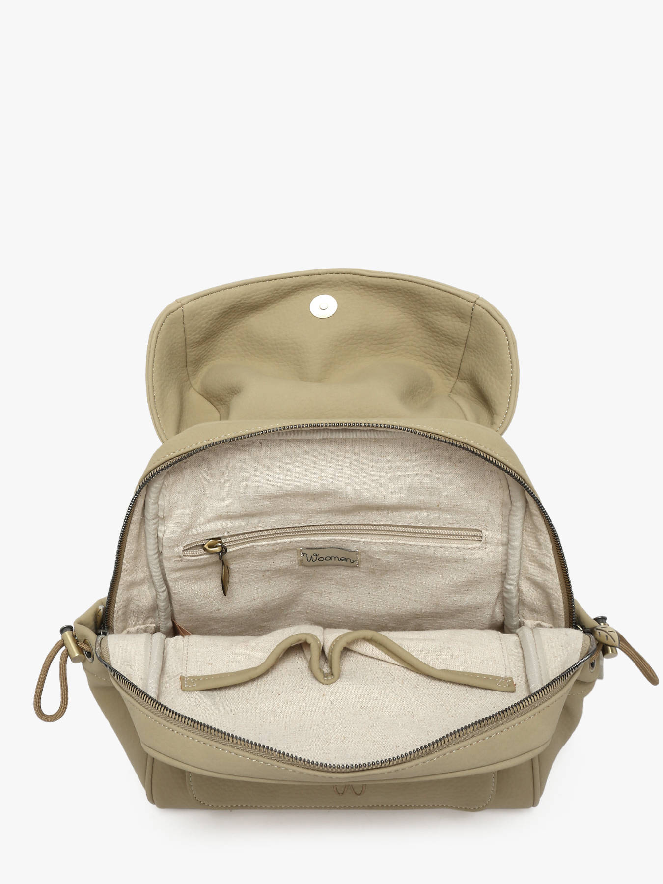 De rugzak WOOMEN uit de lijn Camomille Pearl valt op door zijn delicate parelfranjes en houten ring, en combineert landelijke charme met eigentijds raffinement. Gemaakt van polyurethaan bestaande uit 58% gerecyclede materialen, met een voering van katoen en linnen, biedt hij lichtheid en stevigheid. Hij beschikt over een hoofdvak met ritssluiting, een voorvak, twee zijvakken en een vak aan de achterkant, wat een complete organisatie van je persoonlijke spullen mogelijk maakt. De magnetische flap zorgt voor veiligheid en gebruiksgemak, terwijl de verstelbare schouderbanden van iriserend katoen comfortabel en flexibel dragen garanderen. Het gouden resinelogo geeft het model een verfijnd vleugje. Elegant en functioneel, begeleidt deze rugzak je bij alle situaties, van stedelijke verplaatsingen tot actieve dagen, en voegt hij een origineel accent toe.